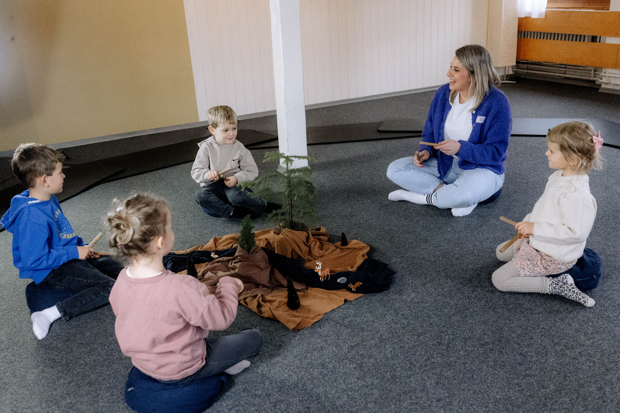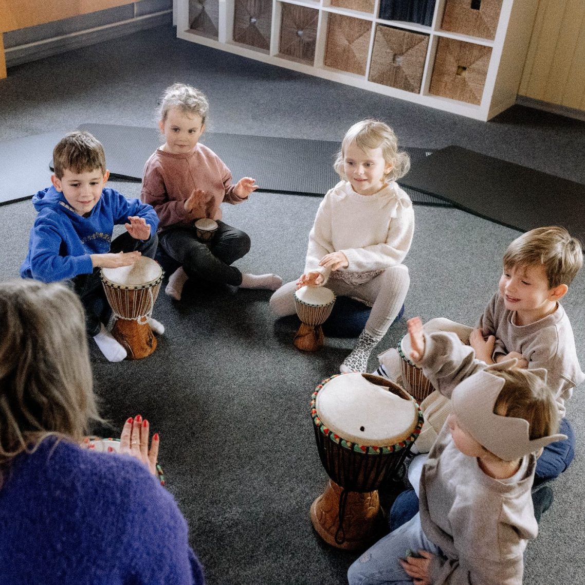 Mit Liedern, Bewegungsspielen, Geschichten und einfachen Orff- und Rhythmusinstrumenten fördern wir Taktgefühl, Konzentration und kreativen Ausdruck. Themen aus dem Jahreskreis, Feste und Rituale geben Orientierung und schaffen eine vertraute, sichere Atmosphäre.